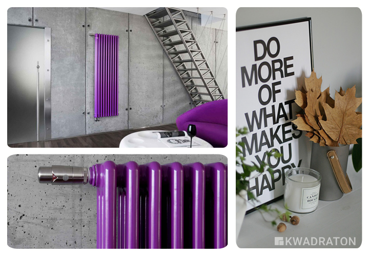 Fioletowy grzejnik i betonowa ściana.