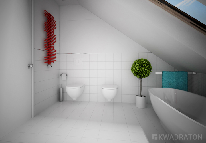Czerwony grzejnik w zestawieniu z turkusem? W białej łazience wszytko jest możliwe.