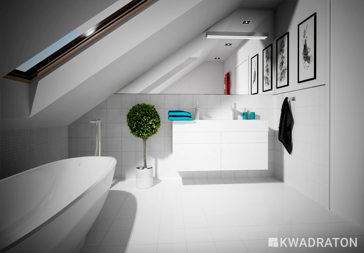 Projektowana biała łazienka dzięki kolorowym dodatkom na pewno nie będzie nudna.