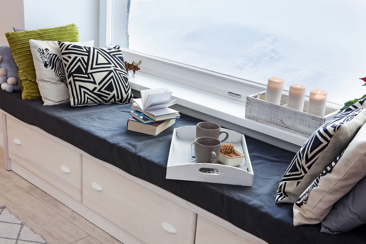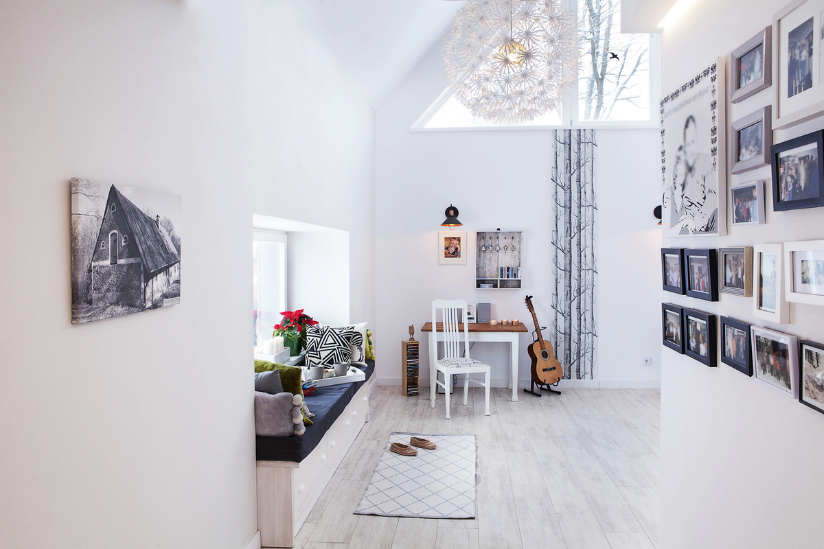 ” Na horyzoncie – Drewnianymi schodami z nowoczesną, szklaną balustradą warto wspiąć się na antresolę, aby móc podziwiać niesamowity krajobraz rozpościerający się przez nietypowe trapezowe okno. W zależności od pory roku widać stąd malownicze polne drogi, barwne kwieciste łąki albo drzewa i szczyty gór otulone śniegowymi czapkami. Dopiero ten widok z piętra pozwala w pełni docenić malowniczy klimat okolicy. ”