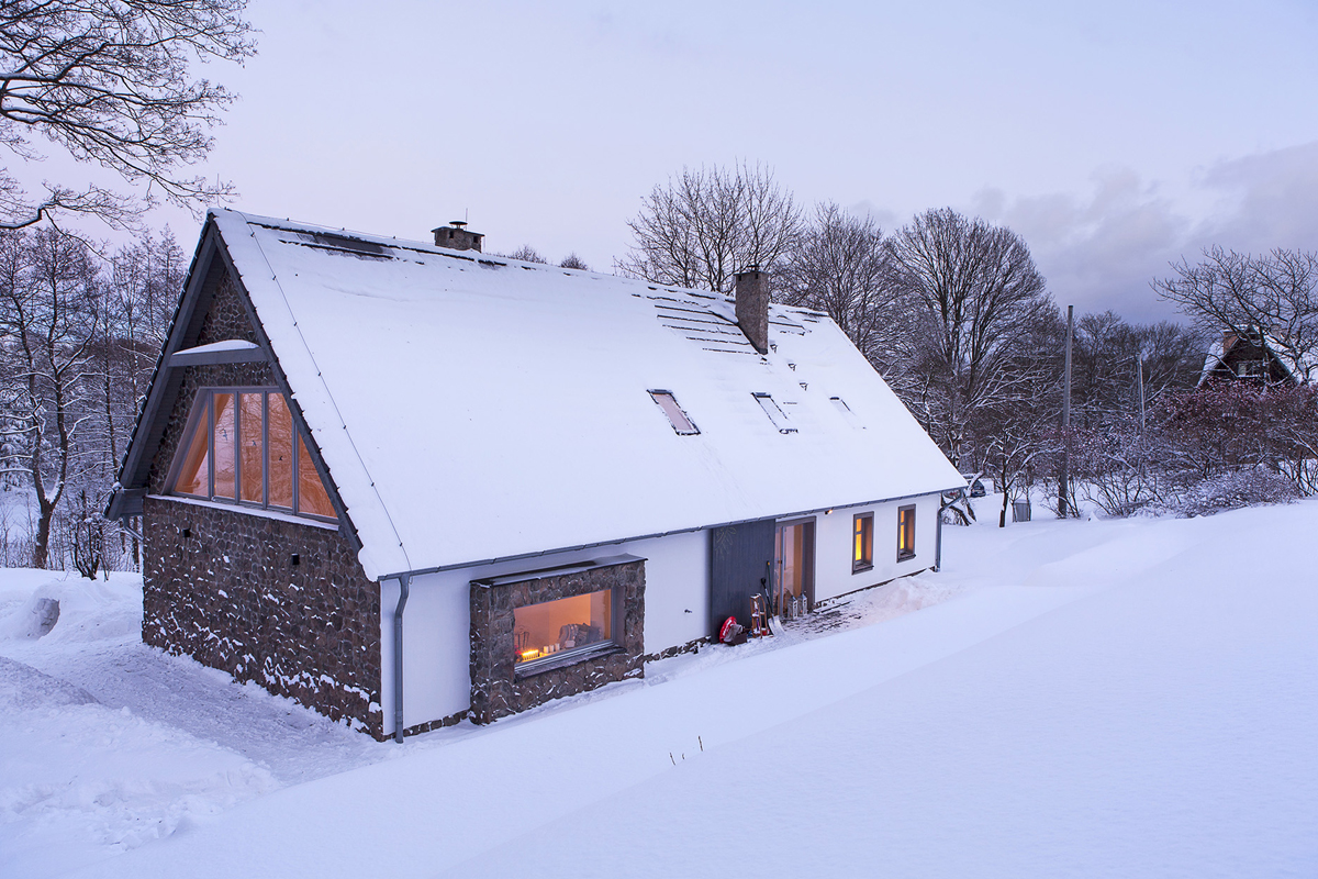 ” Przyszli gospodarze wymarzyli sobie, że będzie to dom weekendowy, całoroczny – urządzony prosto, ale z pomysłem. Po oględzinach wspólnie zgodziliśmy się, że warto w nim zachować jak najwięcej oryginalnych elementów architektonicznych – wspomina arch. Karolina Rutka-Głogocka. Urzekła nas między innymi kamienna piwnica z przepływającym strumyczkiem, oryginalny i coraz rzadziej spotykany strop odcinkowy oraz piękne kamienne portale z piaskowca. ”