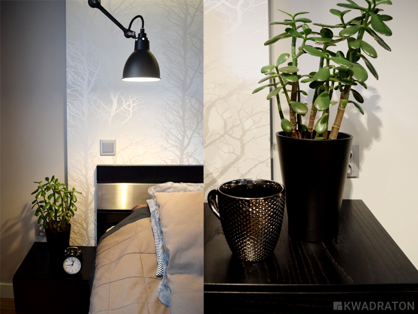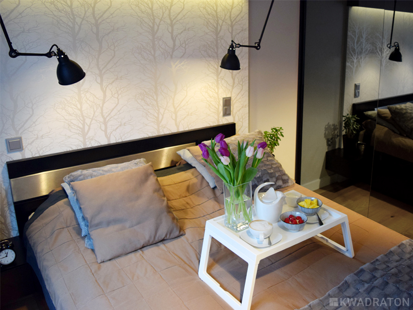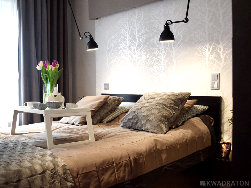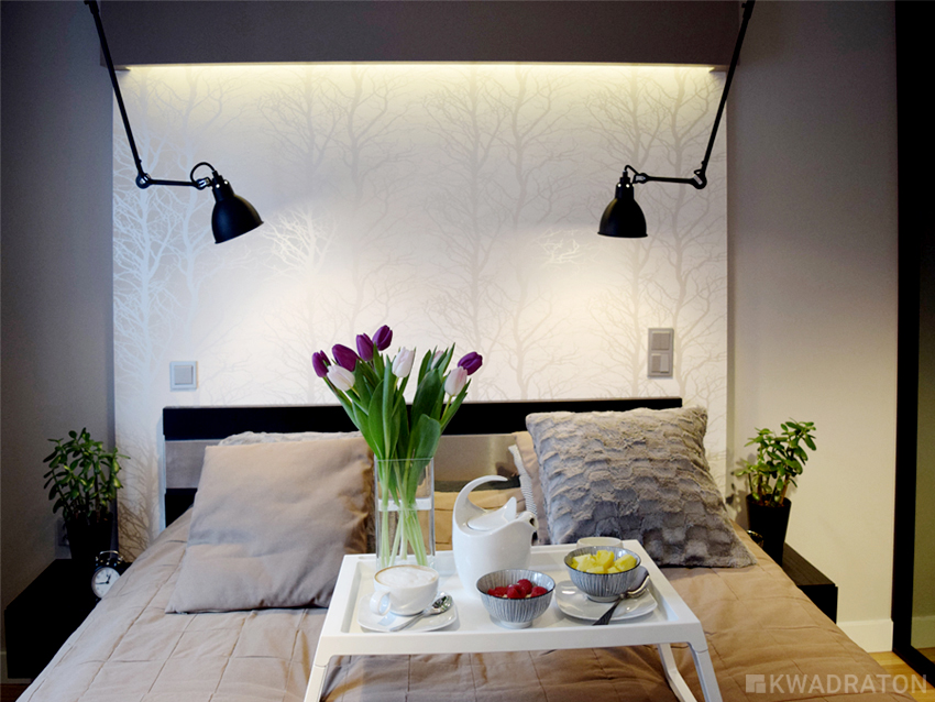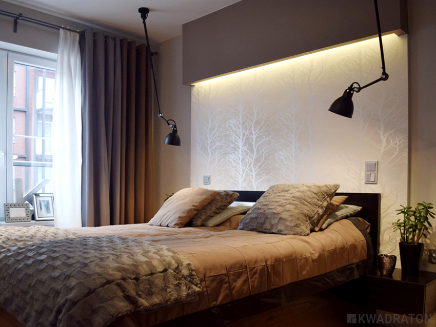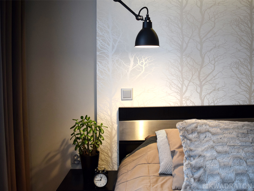 Przedścianka z płyty g-k z tapetą w  drzewa została nieznacznie wysunięta do przodu, tak by nie zabierać miejsca na komunikację.  Zabudowa g-k  z podświetleniem typu led wyróżniona została kolorem w wyniku czego sypialnia zyskała nieco intymny charakter, a strefa snu została wyraźnie zaznaczona. Całość dopełniają czarne lampy na ruchomym ramieniu. Długo trwało nim udało się  dobrać odpowiednie oświetlenie. Lampy Gras mają klosze niewielkich rozmiarów bogatą kolorystykę i co najważniejsze ruchome ramie, które bez przeszkód wygina się w każdą stronę. W tym projekcie są one przysłowiową wisienką na torcie.