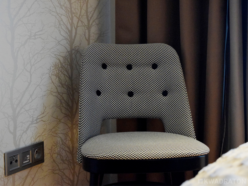 Krzesło w stylu retro z firmy Paged stanowi kolejny ciekawy dodatek. Tapicerka w czarno-białą kratkę i czarne guziki sprawia, że krzesło pomimo prostej formy wygląda ciekawie i przykuwa wzrok.
