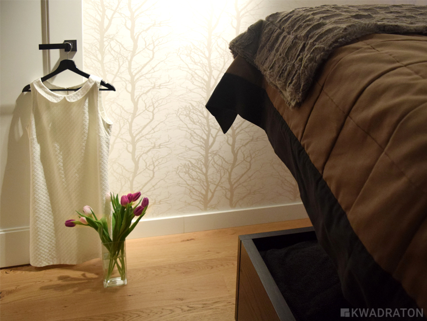 Ściana na wprost łóżka z tapetą w drzewa, stanowi zamknięcie kompozycji całego pomieszczenia. Dzięki temu sypialnia nie potrzebuje już żadnych dodatkowych elementów dekoracyjnych.