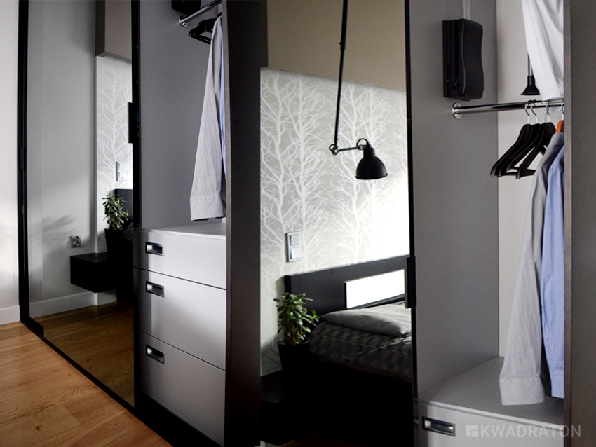 Ważny element szafy z drzwiami przesuwnymi stanowią grafitowe lustra w bardzo cienkiej, prawie niewidocznej ramie. Cały system montowany został do góry dzięki czemu unikamy szyny na dole. Jest to bardzo praktyczne rozwiązanie, sprawdza się zwłaszcza w szafach walk in.