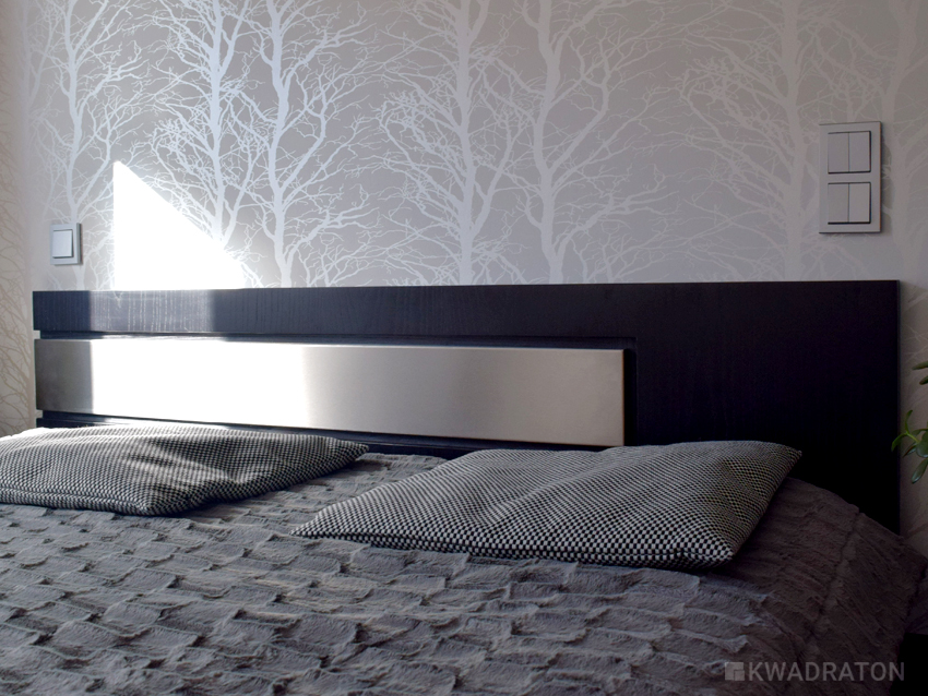 Zagłówek z asymetryczną blachą stanowi jedyny akcent kolorystyczny łóżka, ma na celu rozbicie ciemnej bryły. Szczotkowana blacha rozdziela zagłówek na dwie części i sprawia, że mebel staje się bardziej przestrzenny.