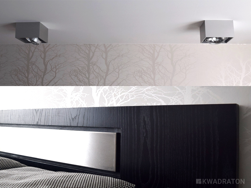 Uzupełnienie stanowią aluminiowe lampy sufitowe z serii box. Lampy doskonale podświetlają tapetą w drzewa, dzięki czemu wyróżnia się ona jeszcze bardziej.