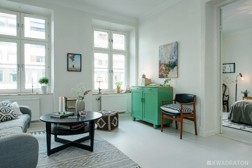 Pomalowana na zielono szafka  stanowi dominantę kolorystyczną w jasnym skandynawskim wnętrzu.