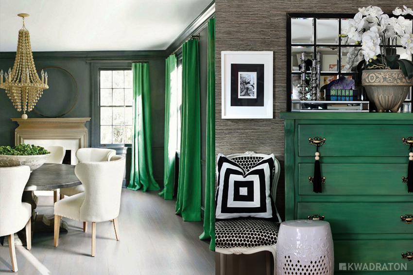 W trakcie pracy nad kolejnym projektem zafascynował nas szmaragd, jego barwa ujęła nas na tyle by zadedykować mu całą ścianę. Kolor szmaragdowy jest niezwykle  wymagający, malując nim ściany musimy pamiętać o tym by były one bardzo dokładnie zaszpachlowane – przy tym odcieniu widoczne będzie każde niedociągnięcie. Ważny jest również umiar, wystarczy jedna ściana by ożywić wnętrze i nadać mu nietuzinkowy charakter. Kolor szmaragdowy częściej sprawdza się w dodatkach, wystarczy jedna szafka lub zasłony czy poduszki by wnętrze zyskało nowy wymiar. Poniżej prezentujemy garść inspiracji w szmaragdowym i zielonym kolorze.  Może i Wam się one  spodobają na tyle by zrobić małą rewolucję i wprowadzić ten odcień zieleni do waszego wnętrza.