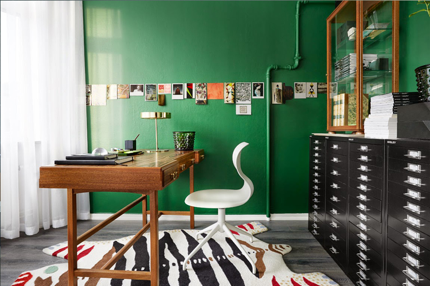 Mocno intensywna zielona ściana w połączeniu z pstrokatym dywanem. W tym wnętrzu nawet instalacja hydrauliczna stanowi element kompozycji.