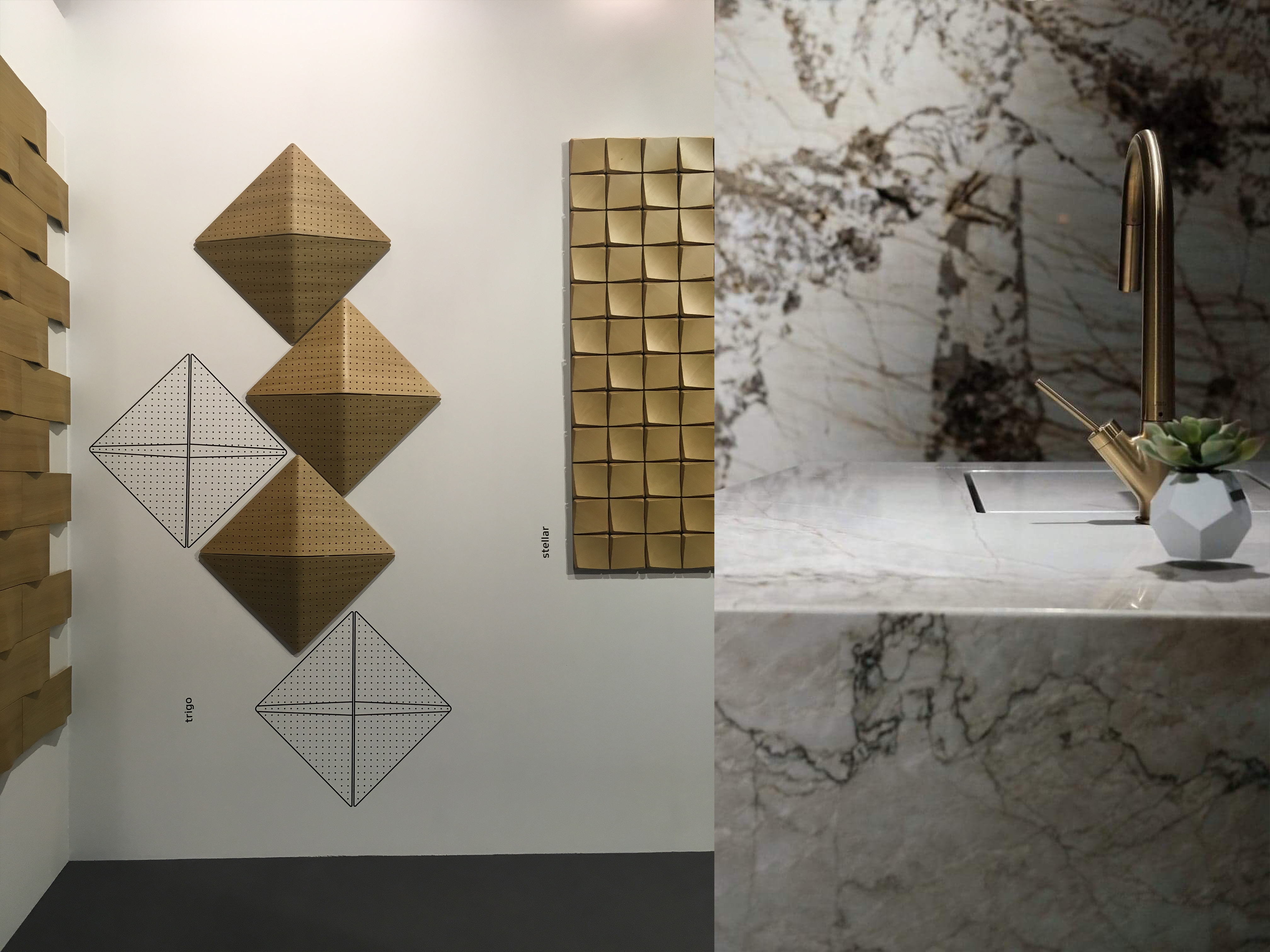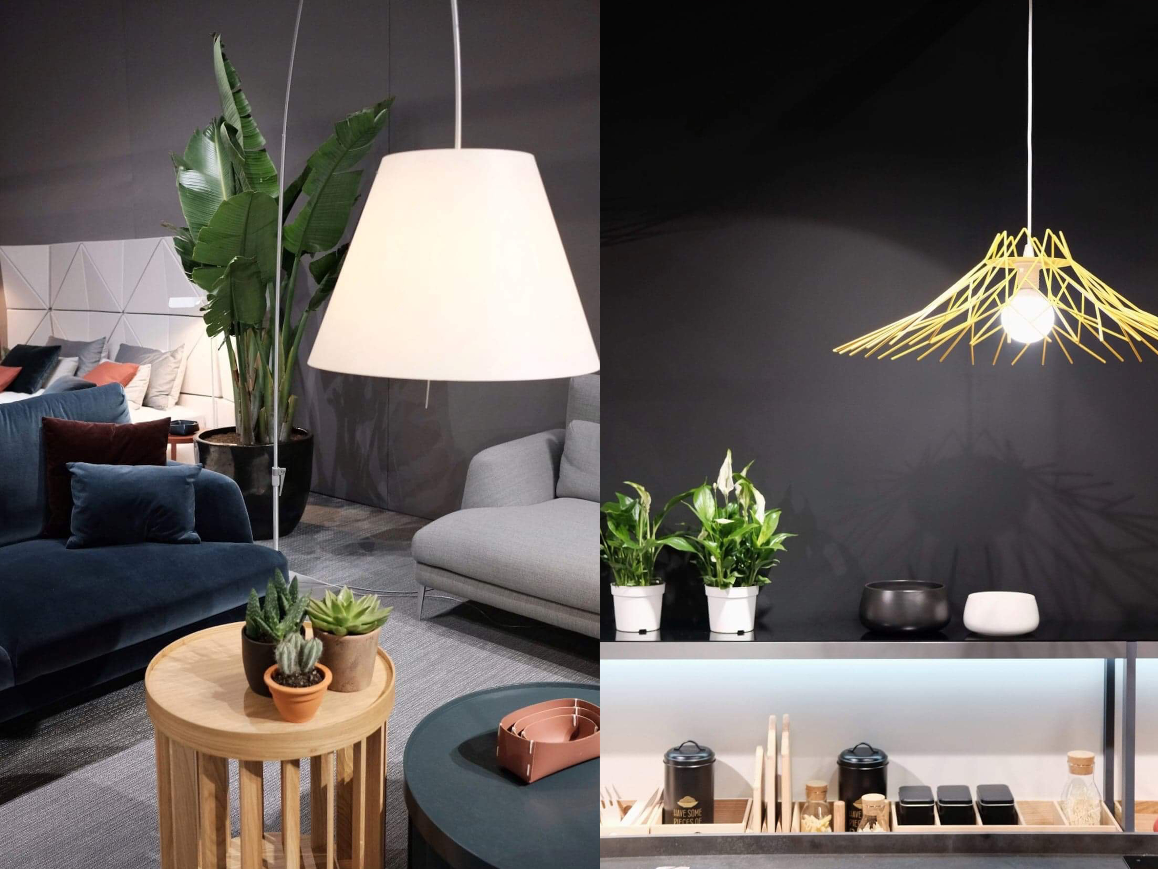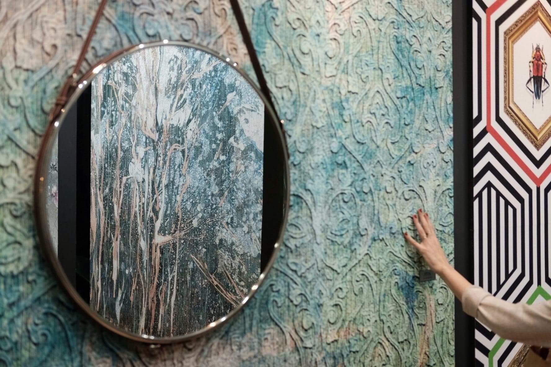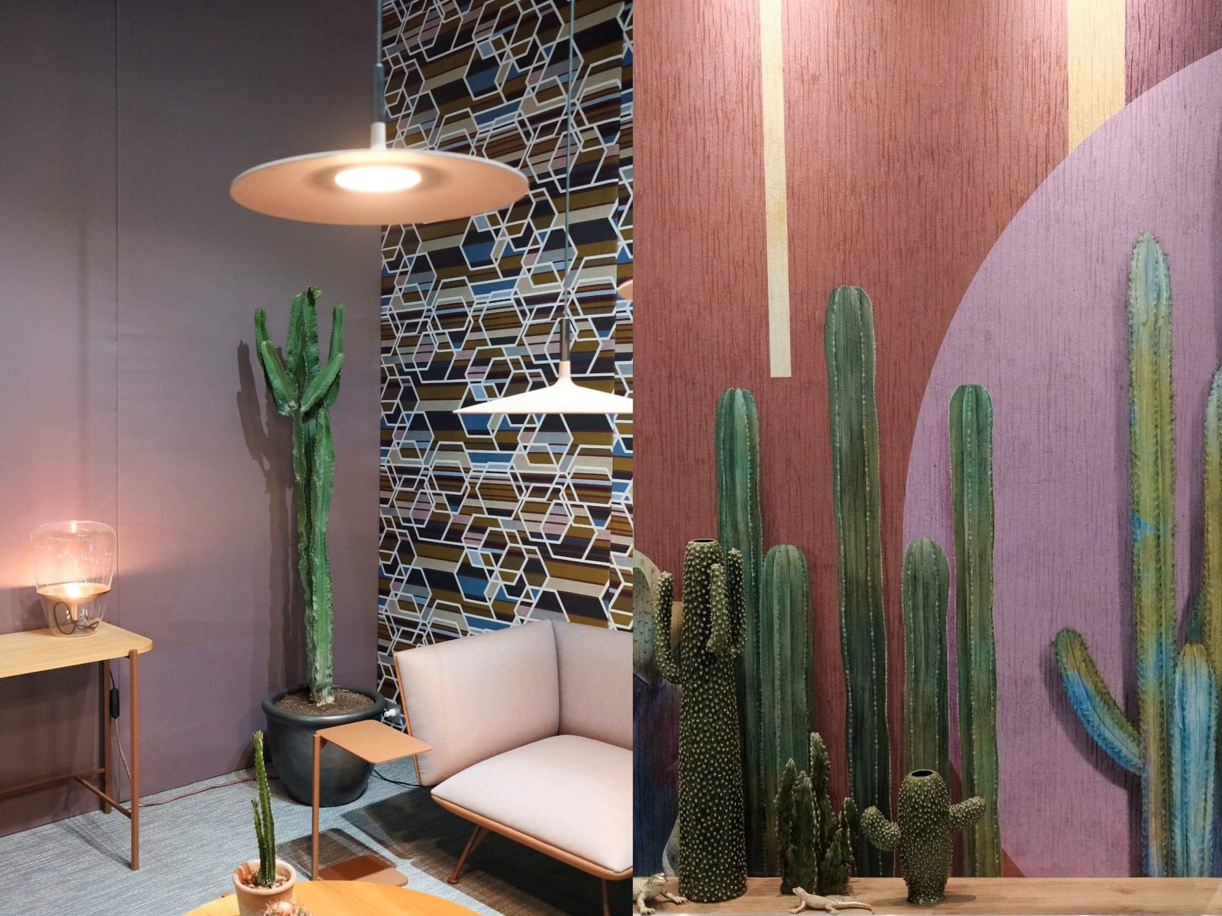 Nasze oko przykuwały również tapety, które swą fakturą jak i wzorem z pewnością ożywią każde z wnętrz. Wzór? To głównie geometryczny, abstrakcyjny oraz tropikalny. Zaskakiwały nas kontrowersyjne i odważne połączenia wzorów oraz kolorów, będące idealnym tłem do mebli, jak i dodatków.