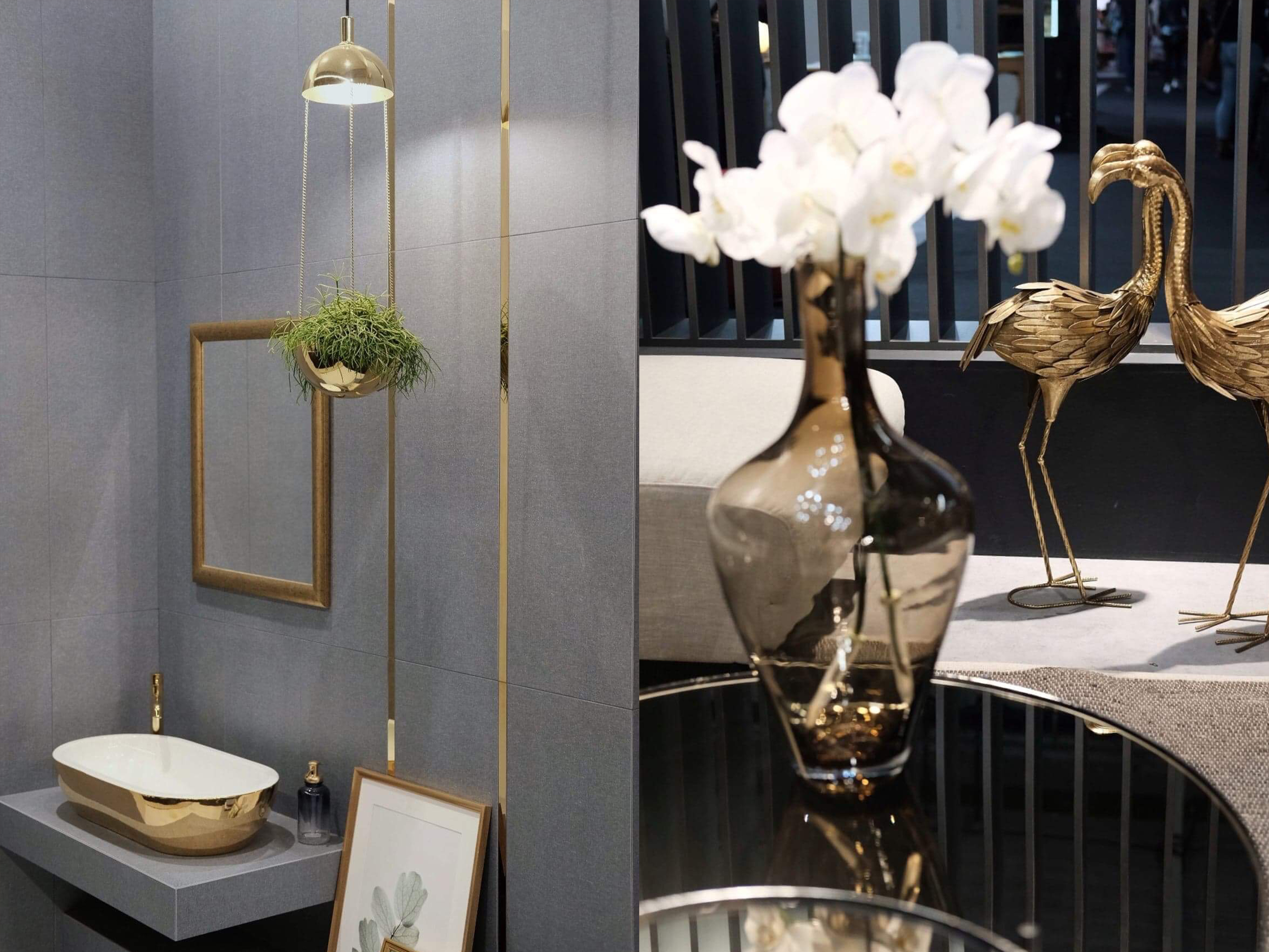 Dlatego też w kręgu zainteresowania były oczywiście dekoracje. Jak dekoracje, to od razu przychodzi nam na myśl złoto. Złoto w każdej postaci. Przejawiało się ono w najdrobniejszej postaci, a zarazem jako detal, który dzięki swojej oryginalności stał się głównym i najważniejszym elementem wnętrza. Świeczniki, doniczki, rzeźby, lustra, armatura, lampy, to jedne z wielu dekoracji, które mogliśmy dostrzec w odcieniach złota, a także miedzi.